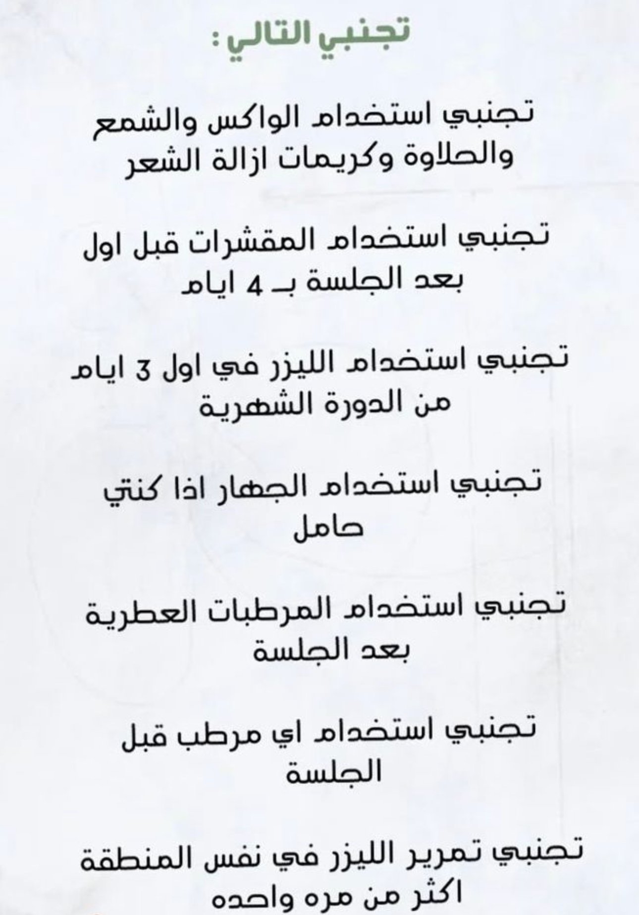 - يجب حلاقة الشعر بالموس قبل استخدام الجهاز (لا يُستخدم على الشعر الطويل أو الواكس).